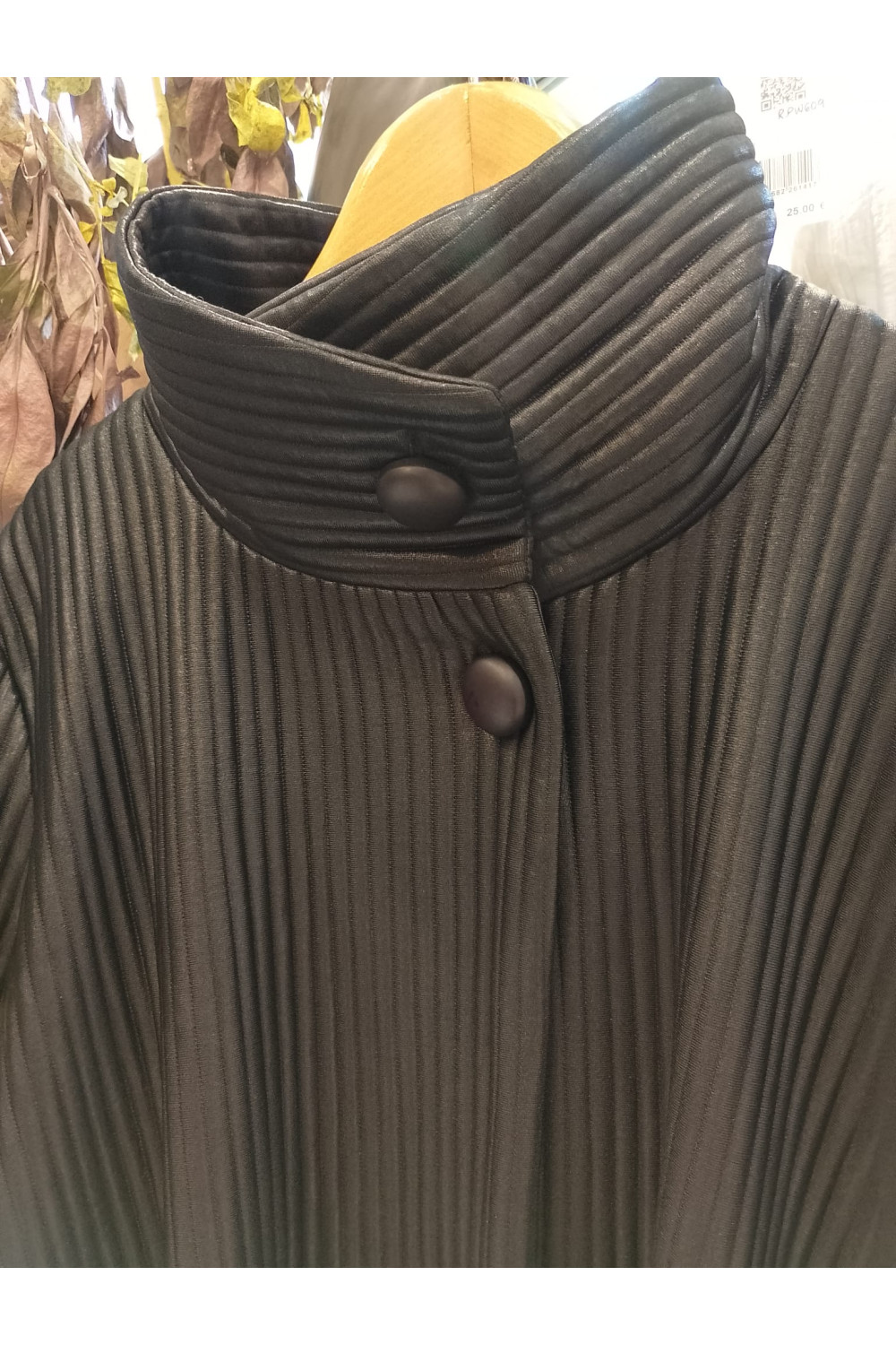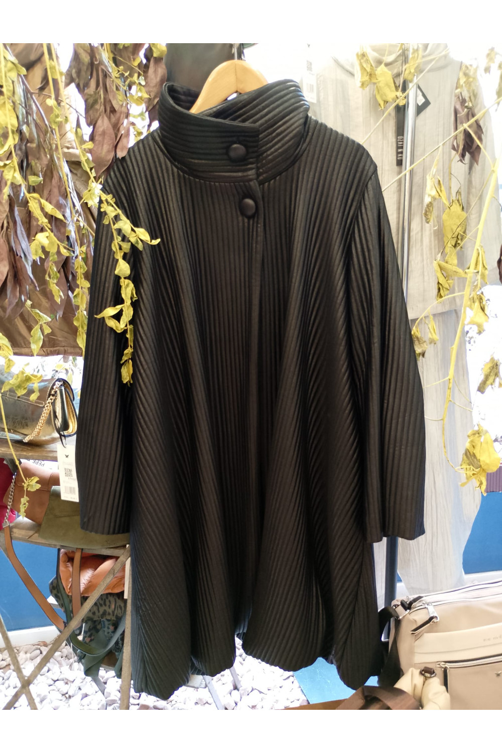 Abrigo largo acolchado con cuello alto de solapa, cierre de botones, mangas largas y anchas y bolsillos laterales.