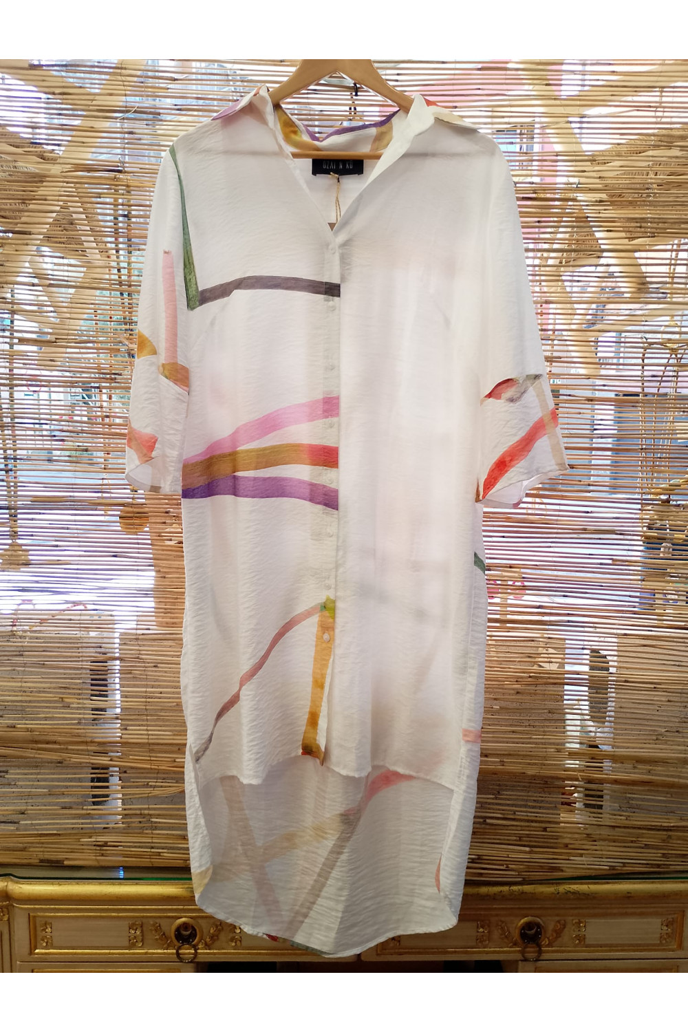 Vestido camisero de longitud midi con mangas tres cuartos y espalda más larga, estampado con motivos de pinceladas coloridas.